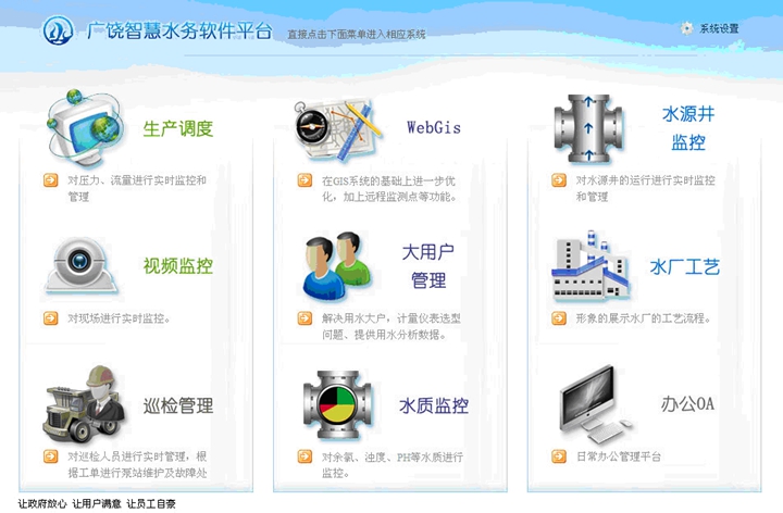 工程規(guī)模:設(shè)計(jì)規(guī)模3.5萬(wàn)噸/日,新建水源井10座,改建原一廠水源井9座,均采用在線遠(yuǎn)程監(jiān)測(cè)、控制。水廠采用地下水-清水池-消毒-二級(jí)泵房的處理工藝。綜合運(yùn)用GIS技術(shù)、CAD技術(shù)、數(shù)據(jù)庫(kù)技術(shù)、網(wǎng)絡(luò)技術(shù)、管網(wǎng)綜合調(diào)度系統(tǒng)(SCADA),建設(shè)了廣饒縣GIS給水管網(wǎng)地理信息系統(tǒng),實(shí)現(xiàn)城市給水管網(wǎng)數(shù)字化全覆蓋,實(shí)現(xiàn)了城市給水全生產(chǎn)過(guò)程的信息化管理。